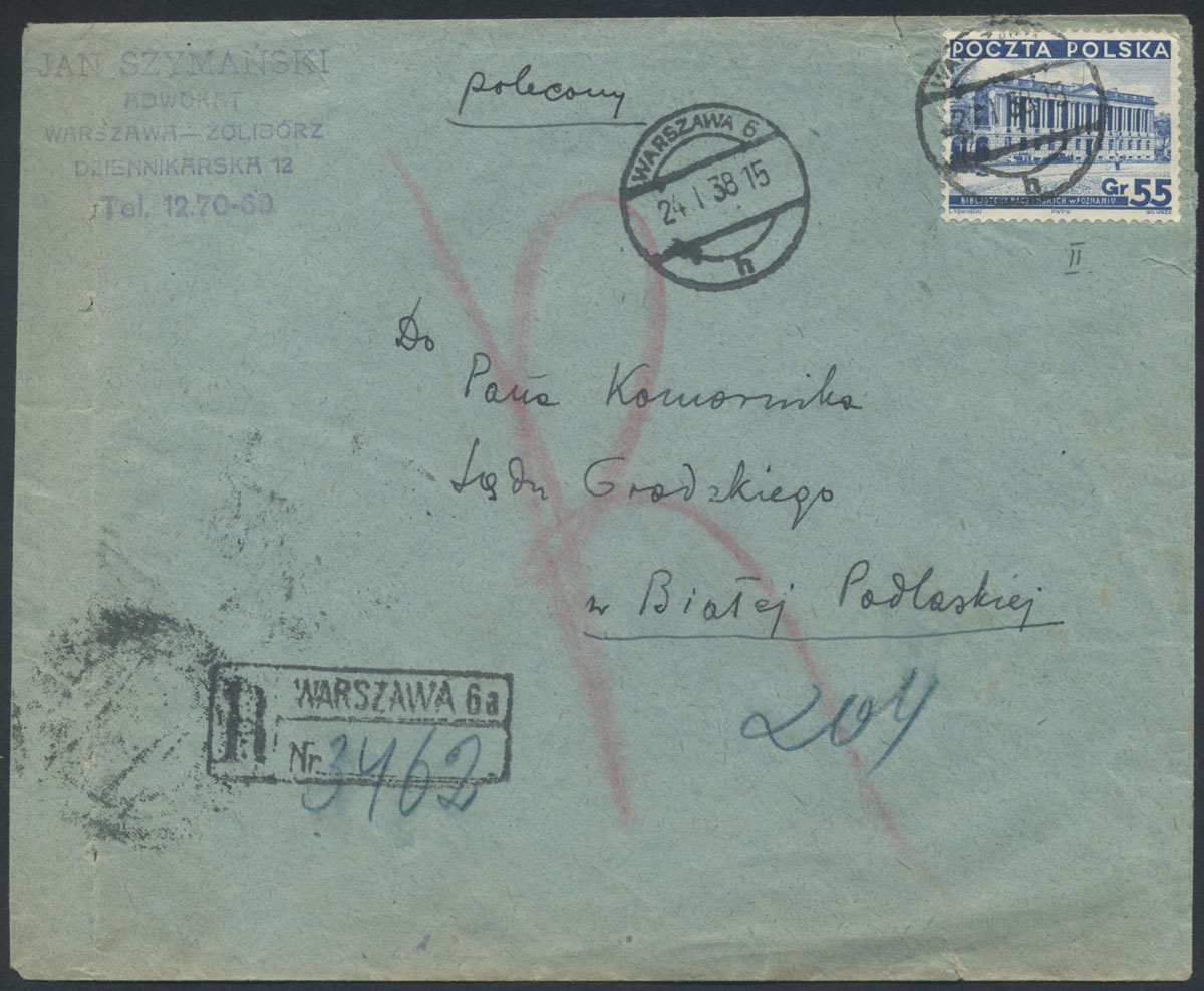 1938 list polecony z Warszawy do Białej Podlaskiej, na odwrocie stempel odbiorczy. | Fi.288 |