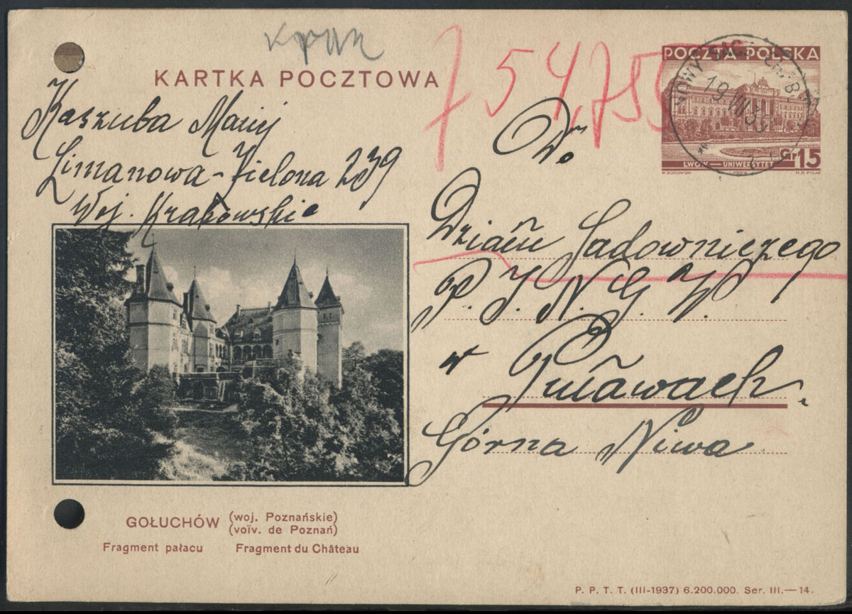 1939 kartka adresowana na pocztę polową Junackich Hufców Pracy, kartki nie przyjęto z zwrócono do nadawcy we Lwowie. | Fi.Cp78 |