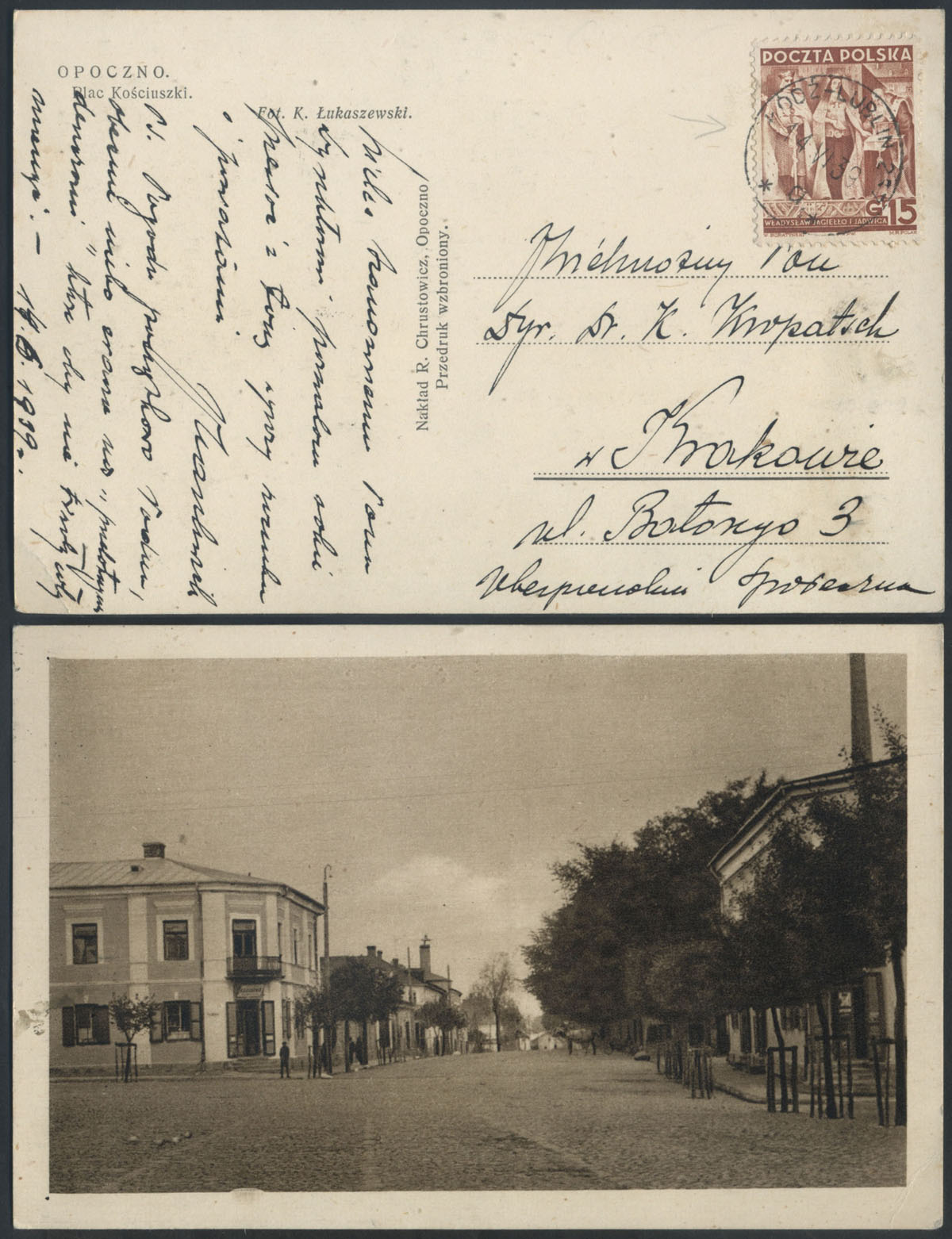 1939 kartka nadana w ambulansie pocztowym na trasie Łódź - Lublin nr 257, kasownik z wyróżnikiem a, widokówka z Opoczna. | Fi.334 |