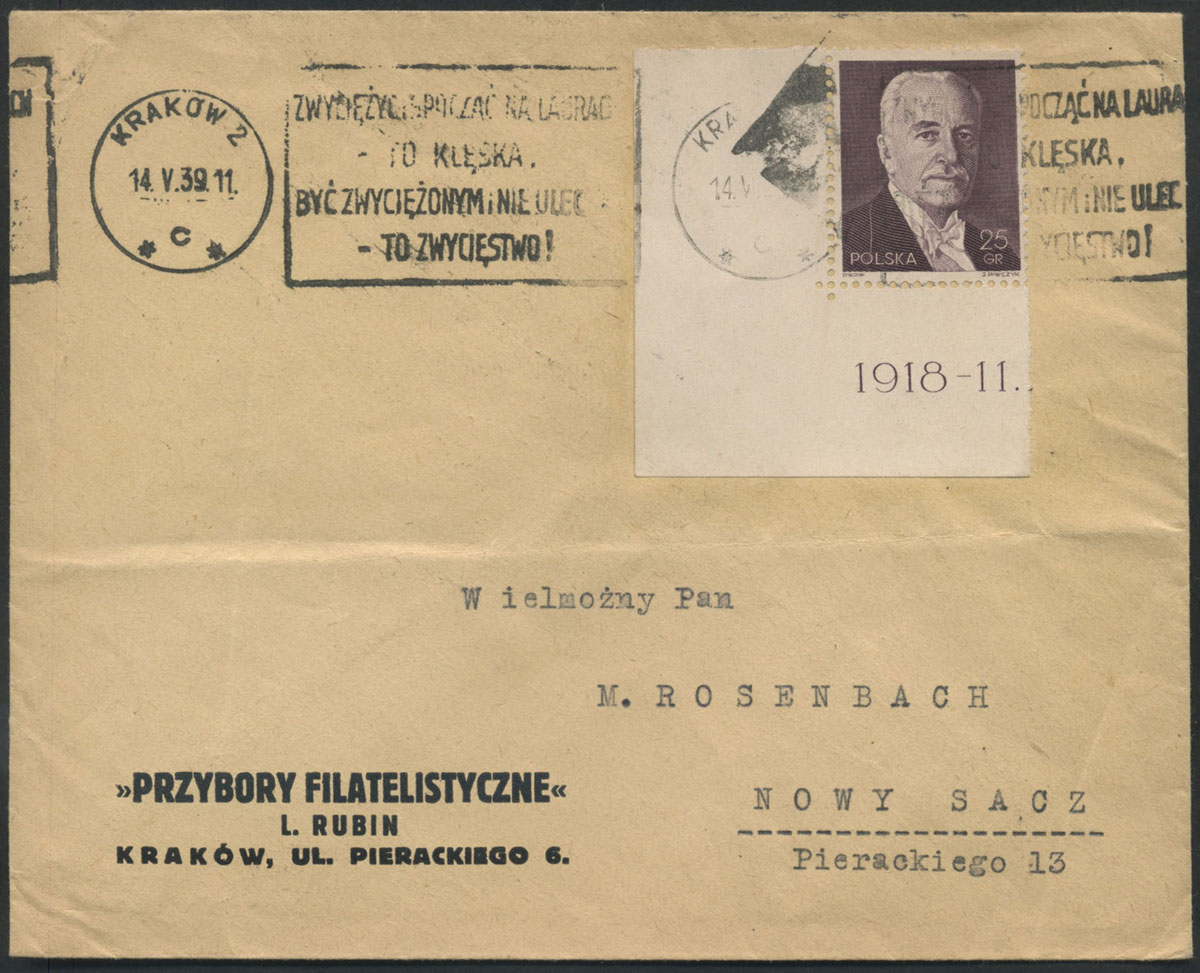 1939 list z Krakowa do Nowego Sącza opłacony znaczkiem z bloku. | Fi.325 |