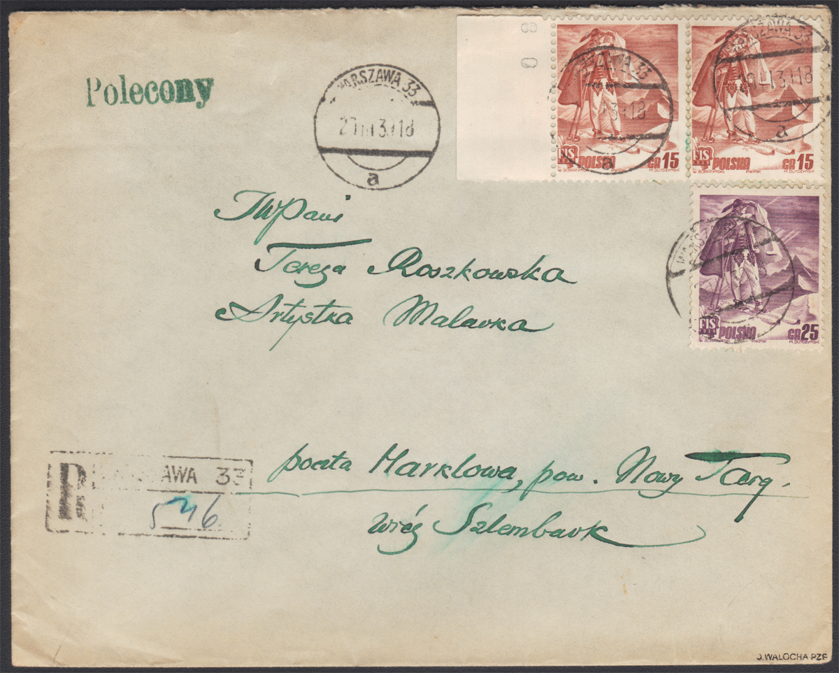 1939 Międzynarodowe Zawody Narciarskie FIS w Zakopanem, 15 + 25 gr - frankatura dwukolorowa, list polecony wysłany 20.III z urzędu Warszawa 33 do miejscowości Szlembark, datownik odbiorczy Harklowa na odwrocie; | Fi.330, 331 Mi.351, 352 |