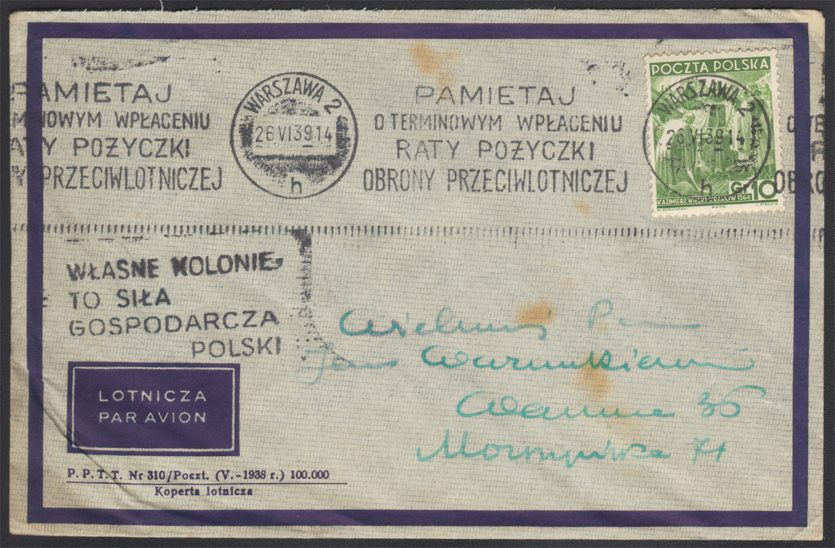 1939 "PAMIĘTAJ O TERMINOWYM WPŁACENIU RATY POŻYCZKI PRZECIWLOTNICZEJ" Warszawa 2 z wyróżnikiem "h" doskonałej jakości odbitka wirnikowego stempla propagandowego odciśnięta 26 VI na kopercie lotniczej o sygnaturze "P.P.T.T. Nr 310/Poczt. (II-1939 r.)"; opłata jak za druki II klasy; co ciekawe odciśnięto też część tekstową stempla "WŁASNE KOLONIE TO SIŁA GOSPODARCZA POLSKI"; kilka miejscowych, niewielkich przebarwień; niecodzienny walor w dobrym stanie zachowania (Myślicki 39 116 + 129). | Fi.311 Mi.332 |