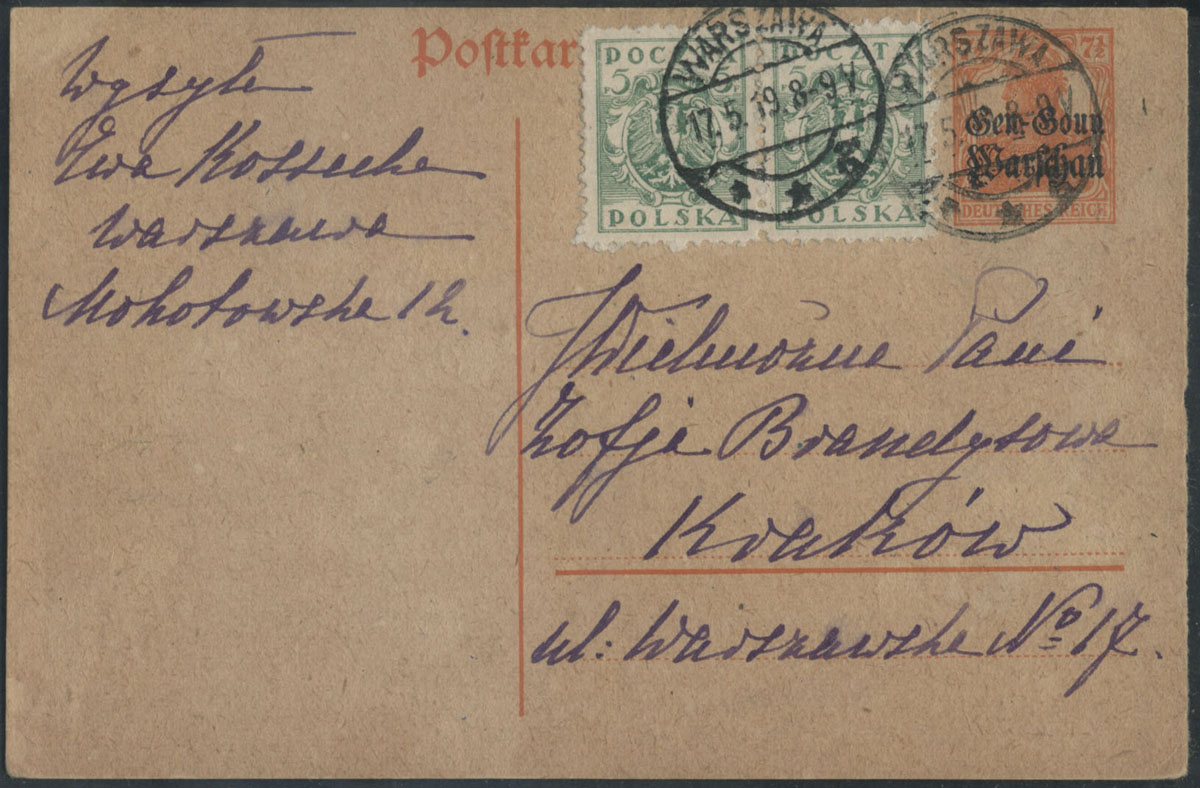 1919 kartka z Warszawy nadana 17.05.19 do Krakowa, co ciekawe do opłaty zaliczono całostkę wydania dla Generalnego Gubernatorstwa Warszawskiego nie mającej już mocy obiegowej, tworząc tzw. mieszaną frankaturę dwóch osobnych administracji pocztowych. | Fi.86B |