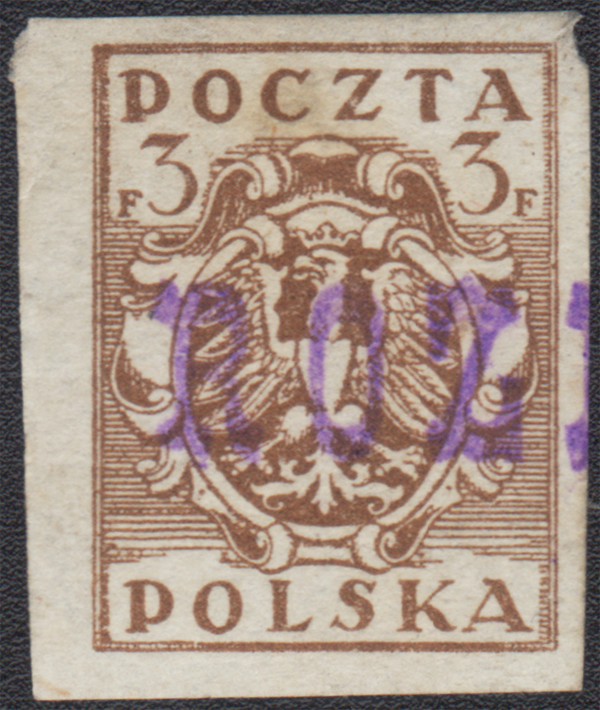 1919 ROZPRZA - wydanie w walucie markowej, nieząbkowany znaczek za 3 fen z bardzo rzadkim kasownikiem prowizorycznym z Rozprzy; dobry stan zachowania. | Fi.85A Mi.89 |