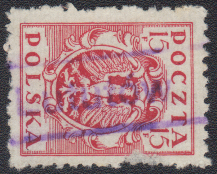 1919-20 wydanie w walucie markowej dla obszaru całej Rzeczypospolitej - nakład C, rzadka próba znaczka za 15 fen. w kolorze karminowym na prążkowanym poziomo cienkim papierze, sygnowana Wróbel, gwarancja. | Fi.88 P8 Mi.92zI |