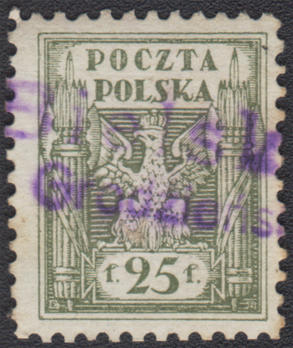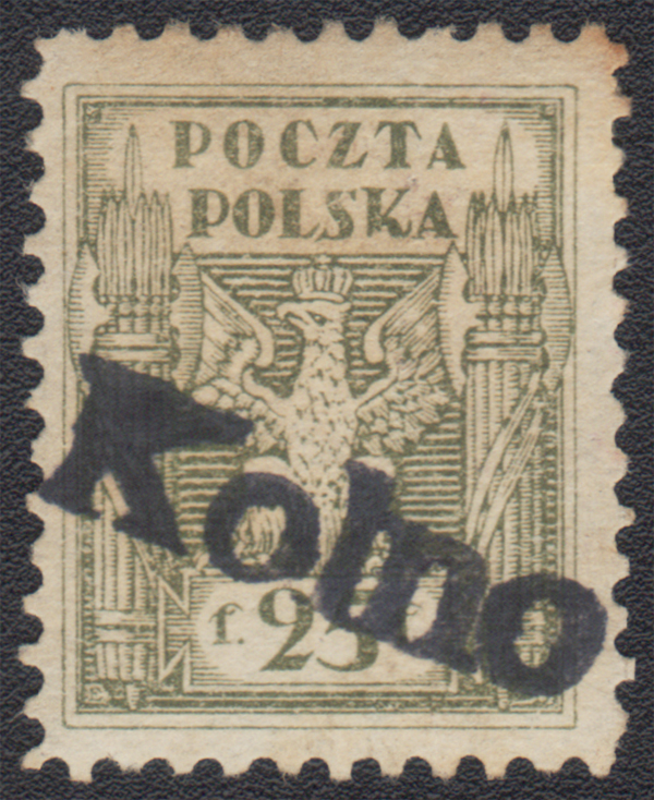 1919 KOLNO - wydanie w walucie markowej, ząbkowany znaczek za 25 fen z kompletnym kasownikiem prowizorycznym z Kolna; dobry stan zachowania (niewielkie przebarwienia). | Fi.90B Mi.106 |