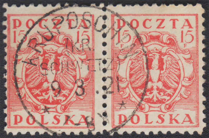 1919 Poczta Polska na Pomorzu, KRUPOCIN - wydanie w walucie markowej, parka ząbkowanych znaczków za 15 fen ładnie skasowanych 9 3 21 praktycznie kompletnym kasownikiem prowizorycznym - niemieckim datownikiem agencji pocztowej KRUPOSCHIN (KR.SCHWETZ); bardzo dobry stan zachowania. | Fi.88B Mi.104 |