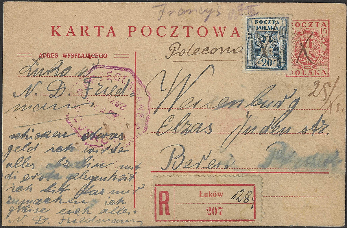 1919 kartka polecona z Łukowa do Francja, czerwona erka Łukowa, znaczki kreślone, stempel cenzury wojskowej w Warszawie. | Fi.89B, Cp30 |
