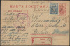 1919 wydanie w walucie markowej, frankatura wielobarwna, całostka (koperta) dofrankowana i wysłana 4.10 jako polecona z Warszawy do Ipswich, rzadka nalepka polecenia pierwszego polskiego wydania w kolorze czerwonym; ośmiokątny stempelek warszawskiej cenzury wojskowej; na odwrocie kasownik odbiorczy; dekoracyjna całość w dobrym stanie zachowania (brak tylnej klapy). | Fi.88B, 89B, Ck6 Mi.104, 105 |