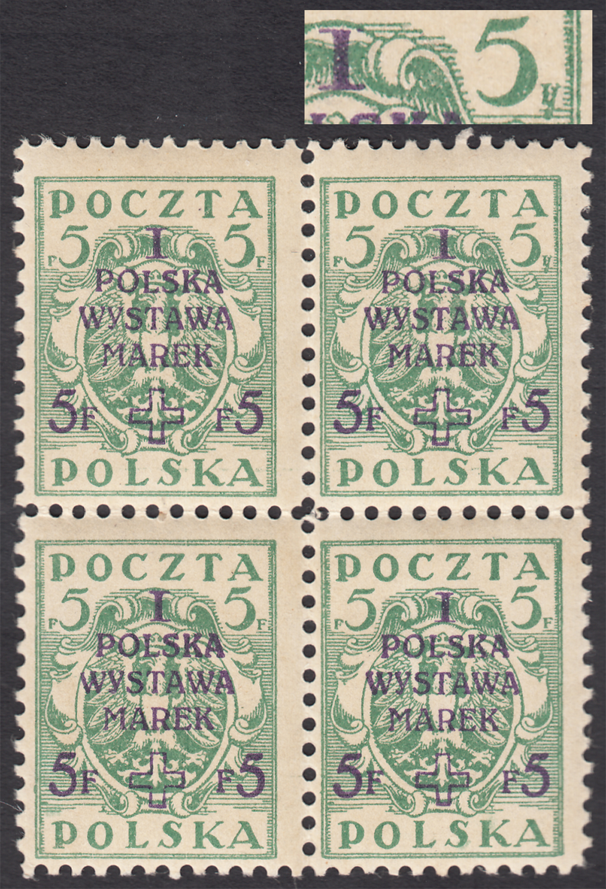 1919 I Polska Wystawa Marek, czworoblok znaczków za 5+5 f., prawy górny z dwoma błędami na znaczku podstawowym z poz.33 "zniekształcone prawe F" i nadruku "brak prawej części górnego szeryfa w I", lewy górny znaczek ma lekki ślad podlepki, bardzo ładny stan zachowania, gwarancja z opisem błędu Walocha. | Fi.102B B1 Mi.188A |
