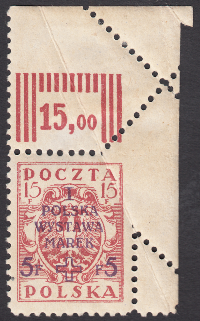 1919 I Polska Wystawa Marek, narożny znaczek za 15+5 f. z zagiętego przy perforacji rogu arkusza, bez części narożnej perforacji poziomej i pionowej - rzadsze niż brak perforacji pomiędzy znaczkiem a marginesem, lekkie podlepki na znaczku i marginesie, ładny stan zachowania, gwarancja Walocha. | Fi.103B MK Mi.119A |