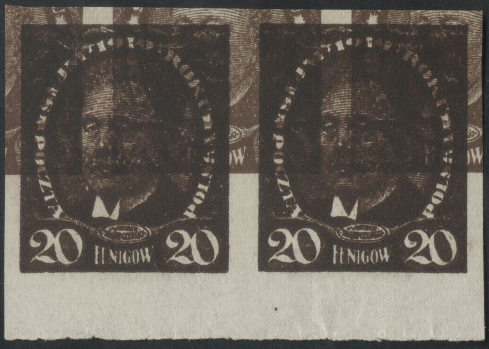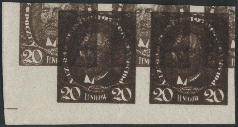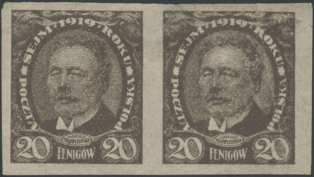 1919 Sejm Ustawodawczy - Marszałek Sejmu W.Trąpczyński - mały format, marginesowa parka makulatury prób znaczków za 20 fen. - niekatalogowana jako potrójny druk, w środku jest to druk lekko zdwojony, a trzeci jest mocno przesunięty na ukos, gwarancja. | Fi.110 P4 Dpt MK Mi.126 |