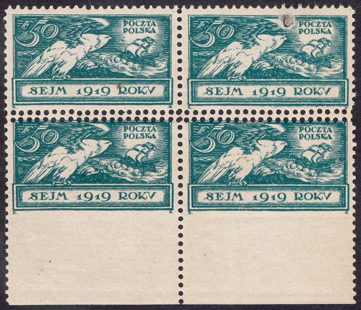 1919 Sejm Ustawodawczy - Orzeł i Okręt, marginesowy czworoblok znaczków za 50 f. z przesuniętym ostatnim w arkuszu ząbkowaniem poziomym - takie jednostkowe przesunięcia perforacji (tylko na jednym poziomie) są rzadkie, na dole arkusza są znaczki z podwójnym ząbkowaniem na górze i jednostronnie cięte na dole, dodatkowo prawy górny znaczek z rysunkiem zniekształconym przez wtrącenie w papierze (wypadnięty węgielek) gwarancja i oznaczenie Walocha. | Fi.112 MK1 + MK3 Mi.128 Uu |
