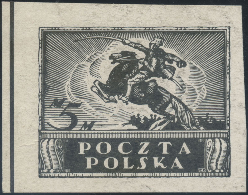 1919-20 wydanie markowe dla obszaru całej Rzeczypospolitej (Fi. nakład C drukowany od maja do sierpnia 1920 roku), niekatalogowany w tym nakładzie znaczek o wysokim nominale 5 mk. w kolorze brązowolila na prążkowanym pionowo papierze bez perforacji pionowej pomiędzy znaczkiem a marginesem po lewej, gwarancja i opis (MK brak ząbkowania na lewym brzegu) Schmutz. | Fi.96b MK Mi.114zI |