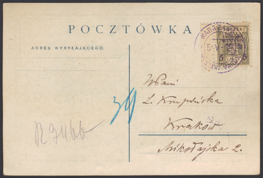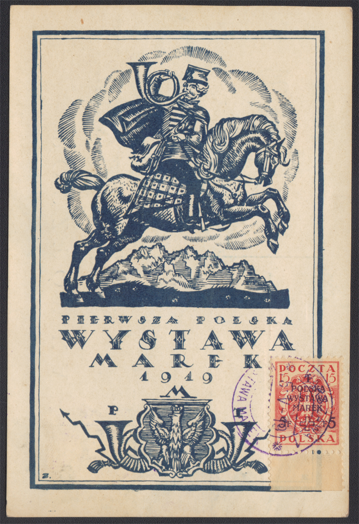 1919 I Polska Wystawa Marek, frankatura dwukolorowa - 15+5 fen + 25+5 fen na okolicznościowej karcie z ciemnoniebieską ilustracją autorstwa Zygmunta Kamińskiego przygotowanej z okazji wystawy, jako polecona (opłata pocztowa zgodna z taryfą) wysłanej 5.V z Warszawy do Krakowa, znaczki skasowane PIERWSZYM POLSKIM STEMPLEM OKOLICZNOŚCIOWYM - WYSTAWA MAREK, oznaczenie polecenia - wpisana ręcznie litera R z numerem 3466; bardzo dobry stan zachowania (Myślicki 19 001). | Fi.104B, 105B Mi.120A, 121A |