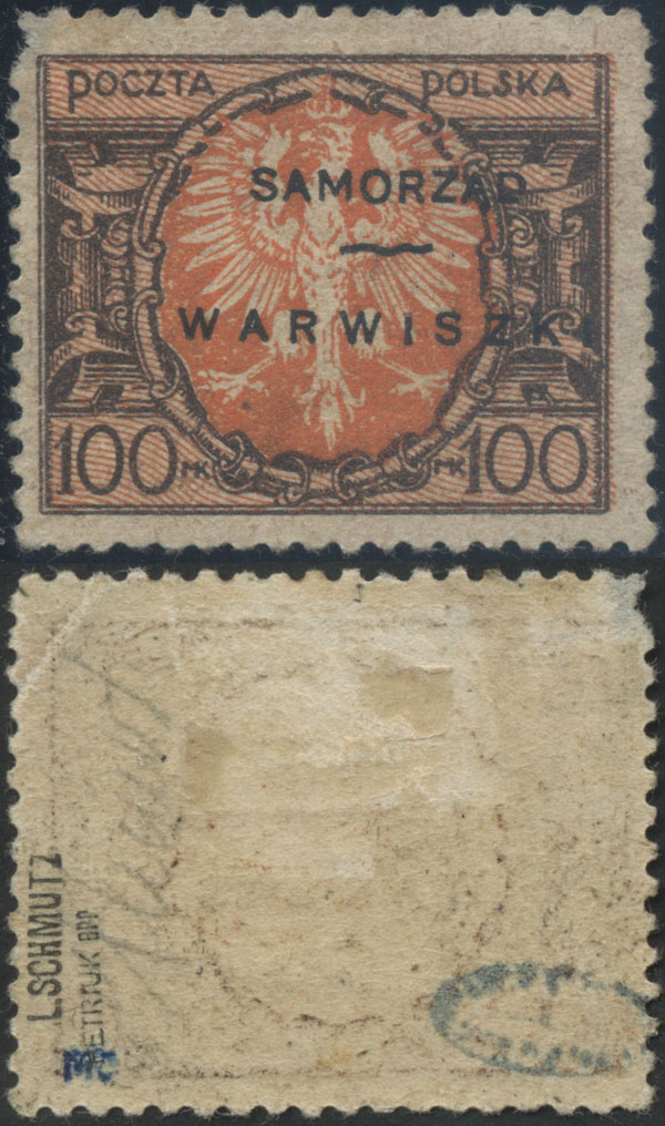 1923 Samorząd Warwiszki, znaczek jednego z najrzadszych wydań przedrukowych na polskich znaczkach, znaczek uszkodzony w lewym górnym rogu, bardzo rzadko oferowany, gwarancja Schmutz, Petriuk. | Fi.2 |