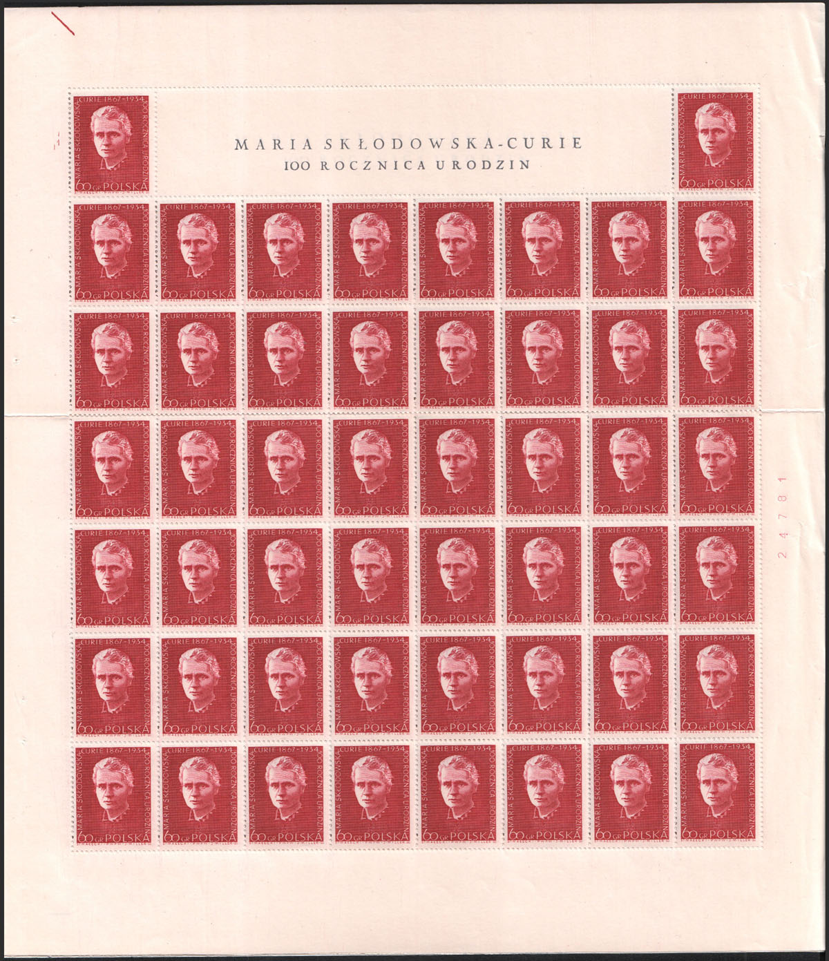1967 100. rocznica urodzin Marii Skłodowskiej-Curie, seria arkuszach sprzedażnych złożonych w połowie, w tym parki rozdzielone przywieszką. | 400 PLN | 1 319 PLN | |
