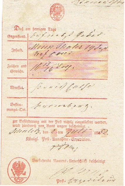 1852 Schulitz (Solec Kujawski), poświadczenie nadania przesyłki pieniężnej. | |