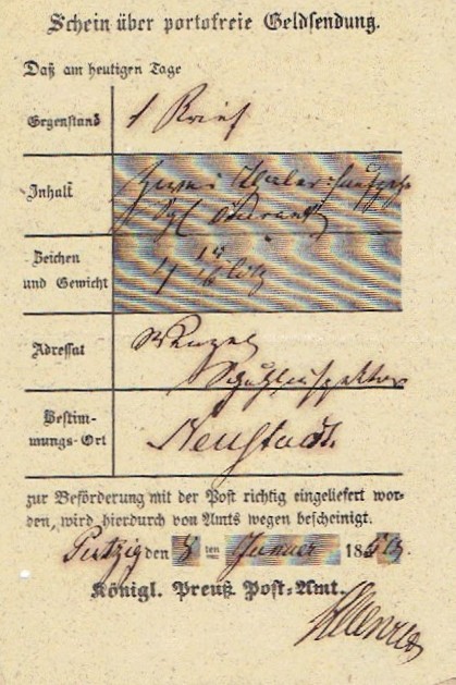 1850 Putzig (Puck), dowód nadania przesyłki pieniężnej do Neustadt (Wejherowo). | |