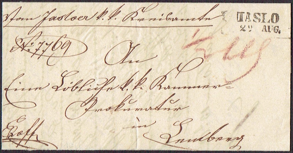 1849 PODHAJCZYKI - kompletny z pełną treścią list urzędowy wysłany z Podhajczyk do Lwowa, czarny dwuwierszowy (pismo ukośne) z datą stempel nadawczy PODHAICZYKI 7 FEB, na odwrocie czarny dwuwierszowy stempel odbiorczy LEMBERG 8 FEB i pieczęć lakowa nadawcy, papier ze znakiem wodnym - J.WEIS; bardzo dobry stan zachowania. | |