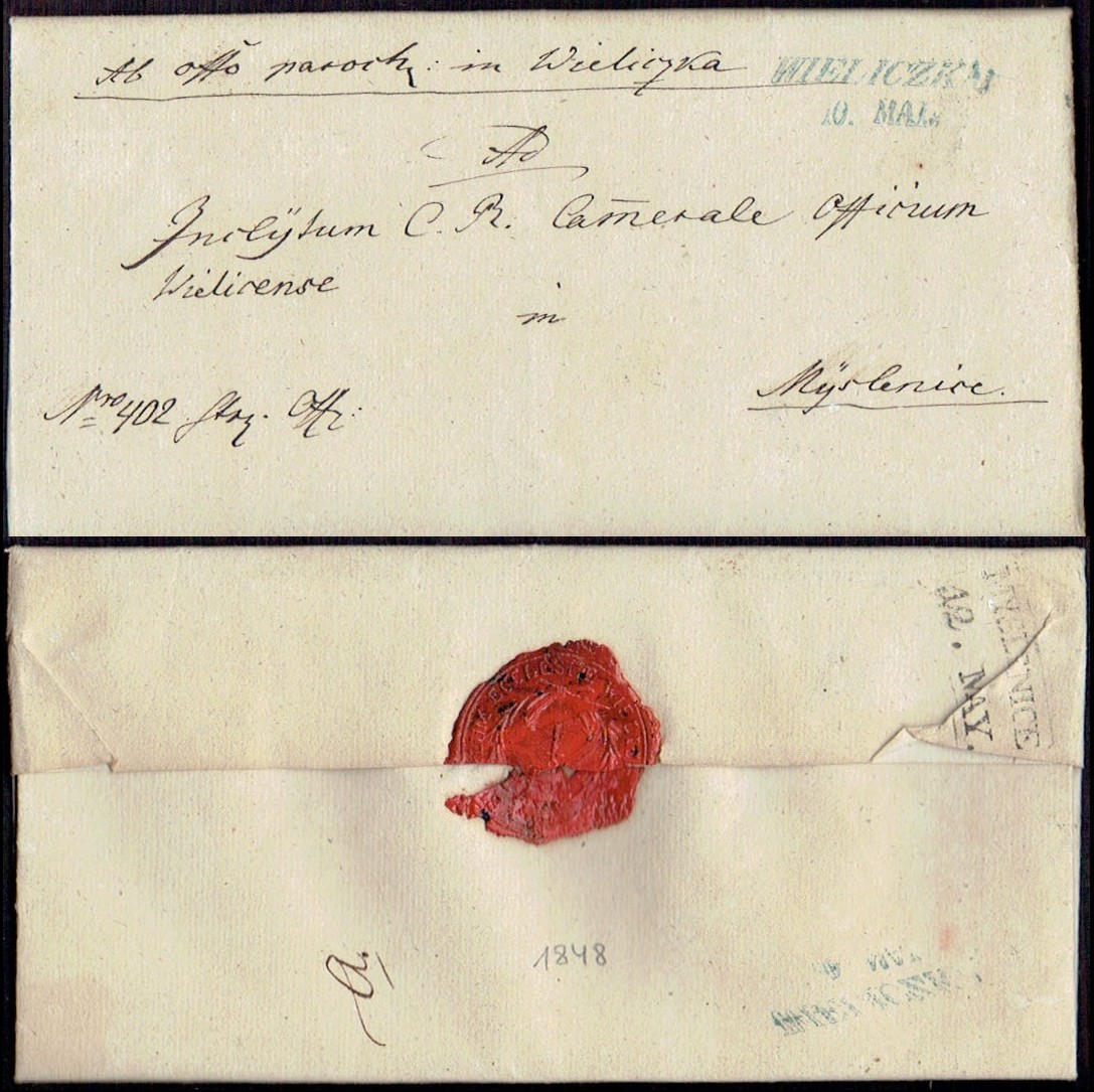 1848 Wieliczka, kompletny list składany wysłany z Wieliczki do Myślenic, stempel nadawczy Wieliczki niebieski, stempel odbiorczy Myślenice, z tyłu pieczęć lakowa. | |