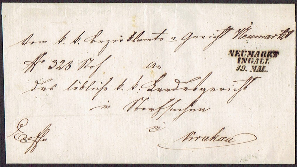 1850 około, Neumarkt (Nowy Targ), obwoluta listu wysłanego z Nowego Targu do Krakowa. | |