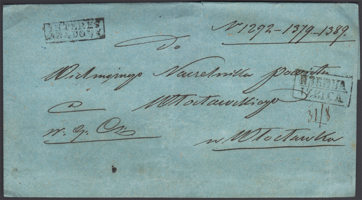 1861 IZBICA - list wysłany 31/8 z Izbicy do Włocławka, czarny dwuwierszowy ramkowy rosyjsko-polski stempel nadawczy typu VIIIB "ИЗБИЦА IZBICA" z kreską ułamkową; stempelek w ramce "INTERES RZĄDOWY" (Czernik typ IIIA) zwalniający korespondencję urzędową od opłaty pocztowej; na odwrocie częściowo zachowana pieczęć nadawcy z godłem; bardzo dobry stan zachowania. | |