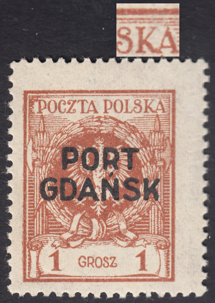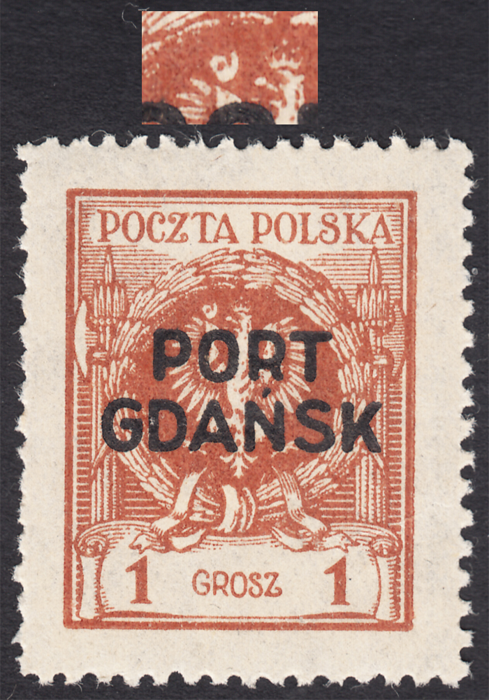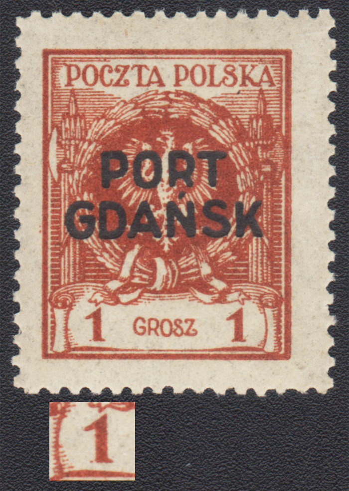 1925 Port Gdańsk, wydanie przedrukowe na nowym nakładzie Orzeł w wieńcu, znaczek za 1 gr. z niekatalogowanym - ale opisanym w PZP pod numerem 1, błędem "brak lewego szeryfa w podstawie lewej cyfry 1", gwarancja Walocha. | Fi.1yI B |