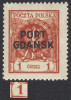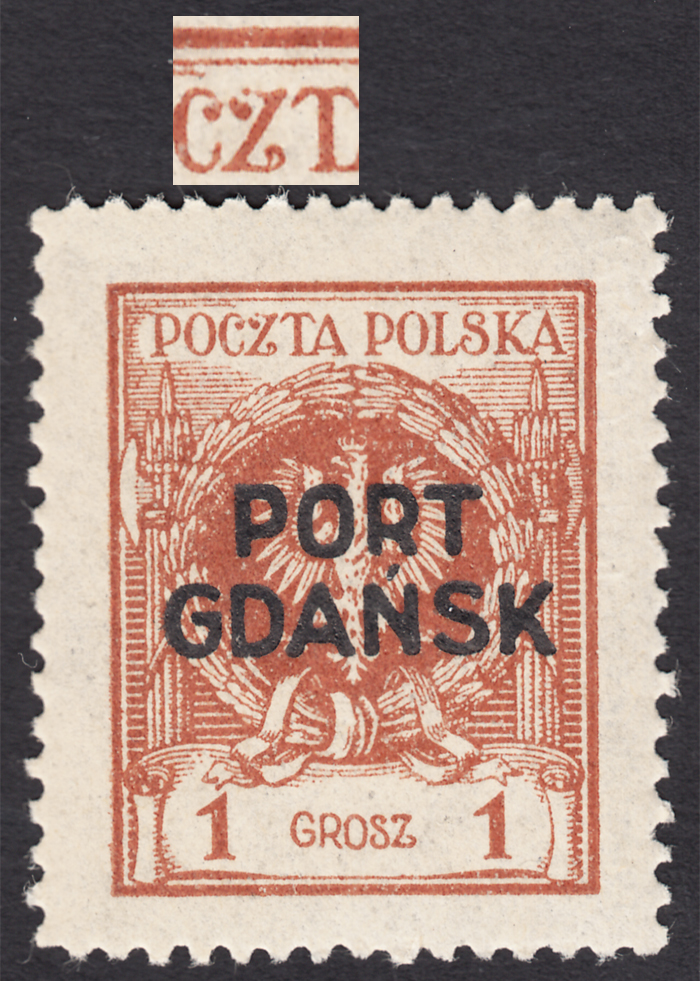 1925 Port Gdańsk, wydanie przedrukowe na nowym nakładzie Orzeł w wieńcu, znaczek za 1 gr. z błędem "uszkodzone Z w POCZTA", gwarancja i opis Walocha. | Fi.1yI B |