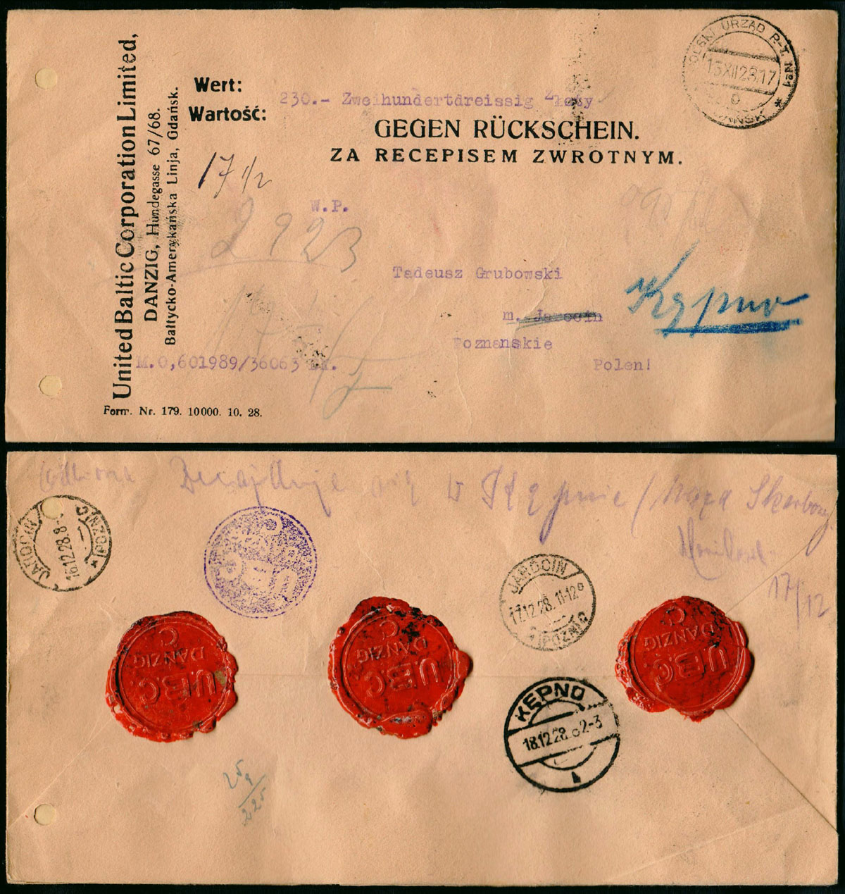 1928 Port Gdańsk, list wartościowy wysłany z Gdańska do Jarocina i przeadresowany do Kępna o wartości 230 zł zabezpieczony 3 pieczęciami lakowymi Banku United Baltic Corporation, na odwrocie stempel odbiorczy, bardzo dobry stan. | |