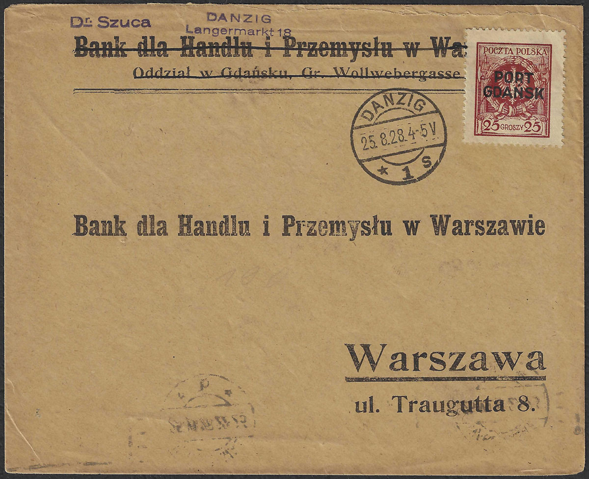 1928 Port Gdańsk, list z Gdańska do Warszawy opłacony znaczkiem dla polskiej placówki pocztowej w Gdańsku nadany w niemieckim urzędzie pocztowym. | Fi.8 |