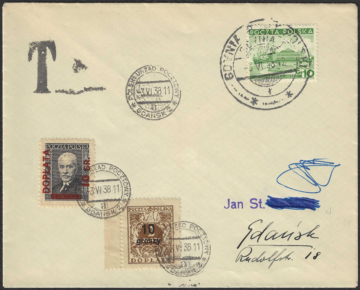 1938 Port Gdańsk, list z Gdyni do Gdańska, brakująca opłatę w podwójnej wysokości pobrano od adresata znaczkami dopłaty. | |