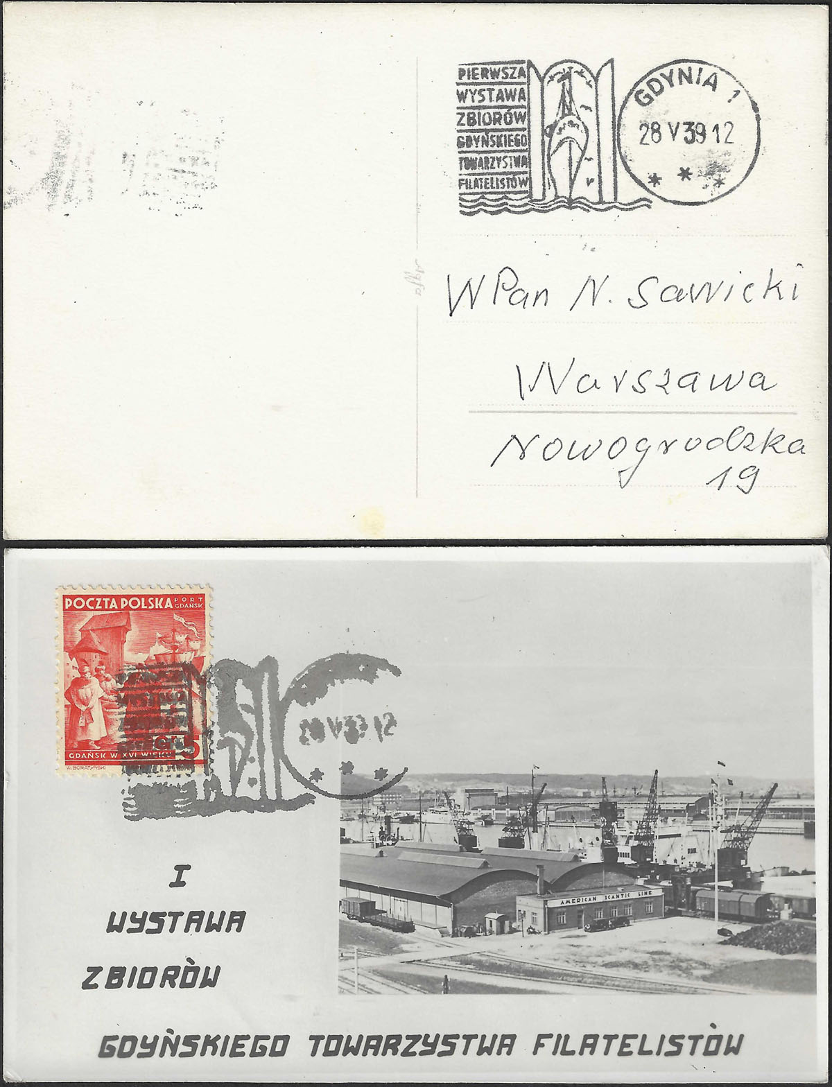 1939 Port Gdańsk, znaczek dla polskiej placówki w Gdańsku ze stemplem okolicznościowym "PIERWSZA WYSTAWA ZBIORÓW GDYŃSKIEGO TOWARZYSTWA FILATELISTÓW", widokówka Gdynia. | Fi.31 |