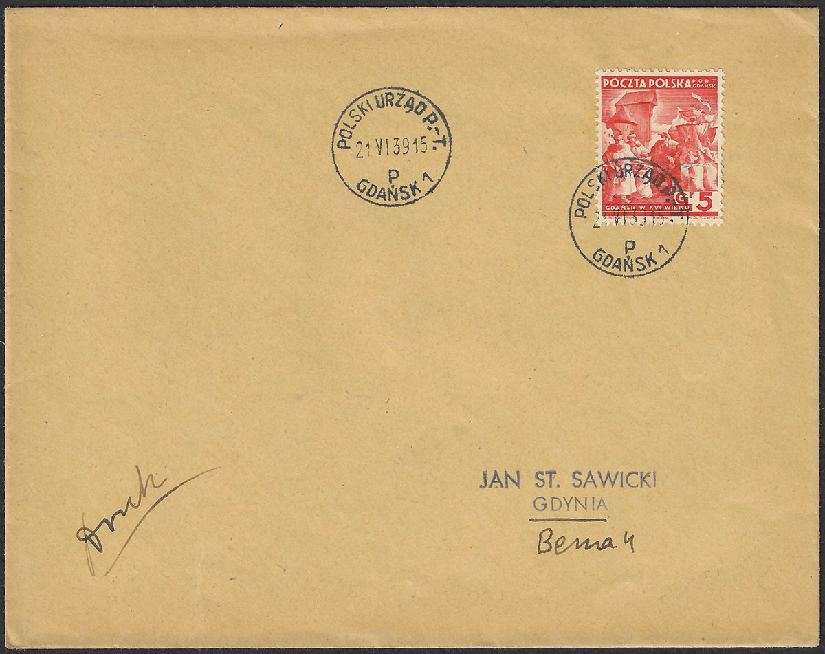 1938 Port Gdańsk, przesyłka do Gdańska przechodząca przez Polski Urząd Pocztowy nr.1 - list polecony wysłany 5.VIII z Warszawy; na odwrocie datownik odbiorczy z 6.VIII - "POLSKI URZĄD P.-T. GDAŃSK 1" z wyróżnikiem "b" z całkowicie zużytymi beleczkami mostka; również na odwrocie nalepka kontroli dewizowej; koperta firmowa "S.ROSSET MAKLER PRZYSIĘGŁY Giełdy Zboż.-Tow. w Warszawie WARSZAWA, CEGLANA 17."; bardzo rzadki walor w doskonałym stanie zachowania. | Fi.299 Mi.320 |