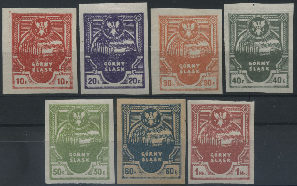 1921 Górny Śląsk - Poczta Powstańcza tzw. wydanie Korfantego, ząbkowana seria czysta z pełną oryginalną gumą, bardzo wysoko wyceniana w katalogach światowych (Fi.1000.-), | Fi.1-7B Mi.1-7A |