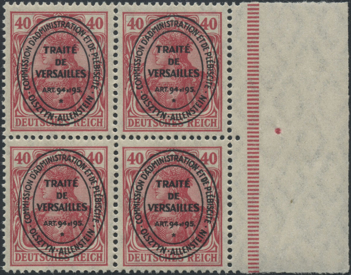 1920 Olsztyn, czworoblok niedoszłych do obiegu poza obrotem wewnętrznym poczty znaczek za 40 fen. w barwie karminowoczerwonej. | Fi.VI |