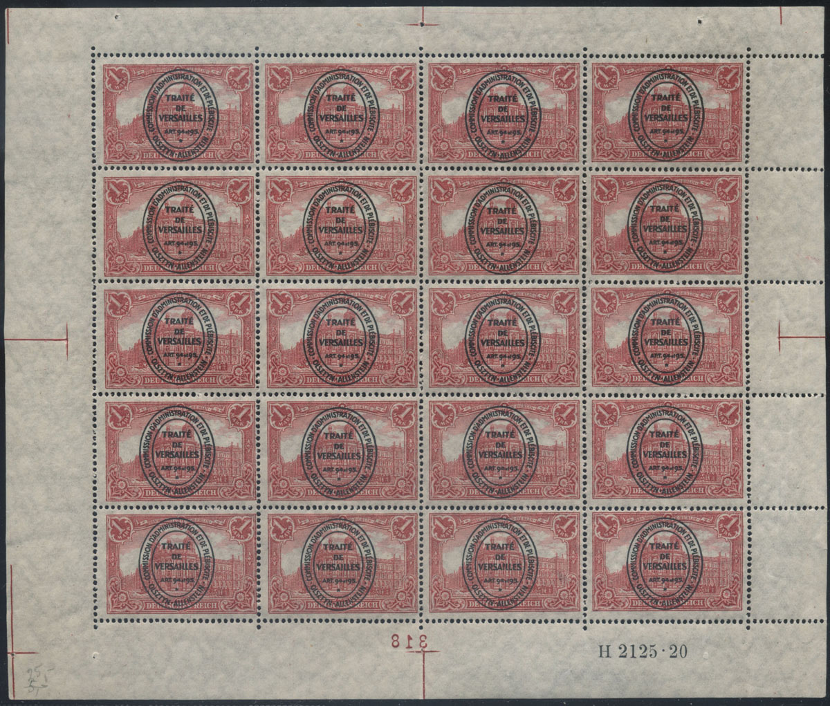 1920 Olsztyn, seria czysta nie dopuszczonych do obiegu znaczków typu Germania, wszystkie trzy wartości 20,30,40 drukowane z płyty - w parkach z fragmentem numeru HAN (nakładu) znaczka podstawowego; wartości 5,10 drukowane z walca nie posiadały takiego numeru; przedrukowano jedynie po pięć arkuszy tych znaczków i może istnieć tylko po pięć parek z pełnym oznaczeniem HAN, piękny stan z pełną oryginalną gumą bez podlepki, cena zwykłej serii (Fi.5000.-), kolorowy fotoatest Mikulski. | Fi.I-V Mi.II-VI |