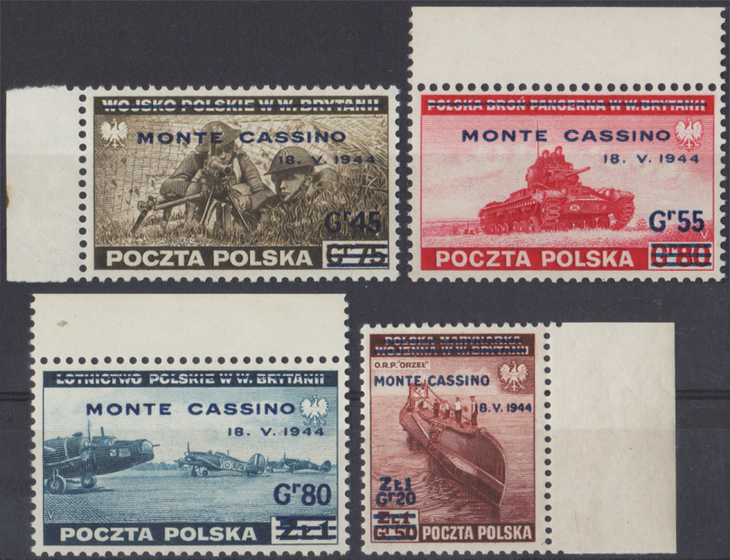 1944 III wydanie Polskiego Rządu na Emigracji w Londynie, zdobycie Monte Cassino, czysta seria przedrukowa z marginesami w pięknym stanie (Fi.360.-). | Fi.P-T338 Mi.376-79 |
