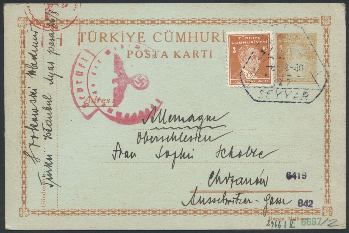 1940 kartka z Turcji do Chrzanowa, stempel niemieckiej cenzury. | |