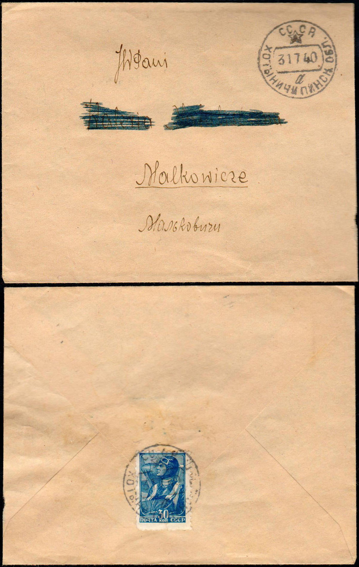 1940 tereny anektowane przez ZSRR, list z Chotyniczy nadany 31.07.40 do Malkowicz opłacony radzieckim znaczkiem i unieważniony radzieckim stemplem. | |