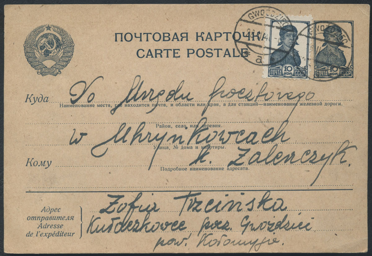 1940 obszary anektowane przez ZSRR, kartka z Gwoźdźca nadana 28.02.40 do Zaleszczyk, polski przedwojenny kasownik. | |