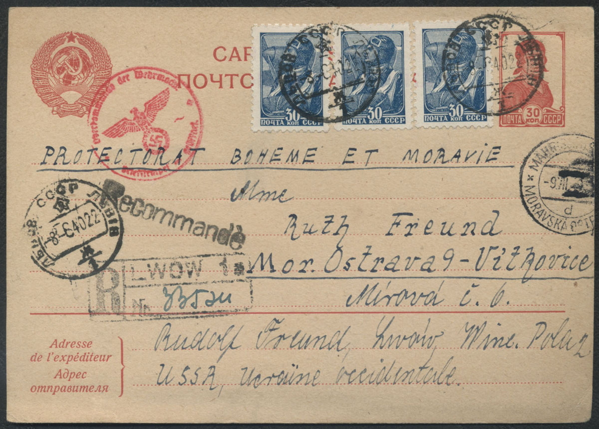 1940 obszary anektowane przez ZSRR, kartka polecona z Lwowa nadana 8.06.40 do Moraw, polska przedwojenna erka. | |