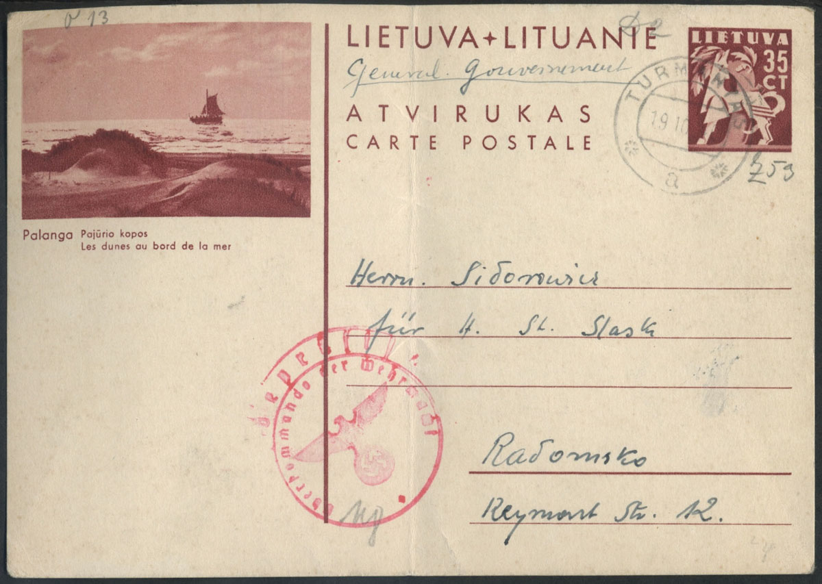 1940 kartka z Litwy pisana po polsku do Radomska, stempel cenzury Wermachtu. | |