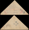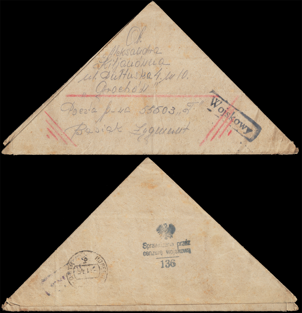 1945 Ludowe Wojsko Polskie, list "trójkąt" oznaczony stempelkiem "Wojskowy", wysłany 3.1 do Warszawy za pośrednictwem poczty polowej 55503 (8 Bydgoski Pułk Piechoty 3DP), radziecki datownik nadawczy z godłem ZSRR, stempelek cenzury wojskowej 136; dobry stan zachowania. | Fi.5 |