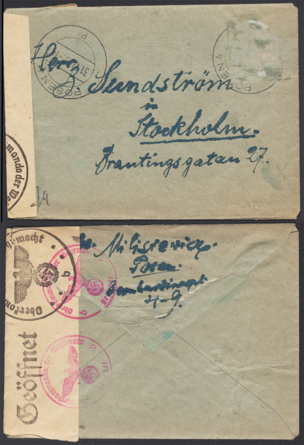 1943 Obszary anektowane przez Niemcy, list zagraniczny wysłany 31.12 z Poznania do Sztokholmu, datownik nadawczy "POSEN 4" z wyróżnikiem "p", zlepka i stemple cenzury niemieckiej; słabszy stan zachowania - znaczek zdjęty (cenzura?). | |