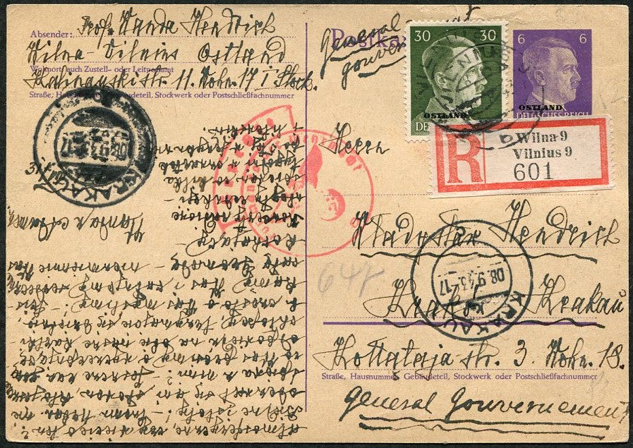 1943 Vilnius (Litwa), karta polecona wysłana z Wilna do Krakowa, dwa znaczki posiadają nadruk "OSTLAND". | |