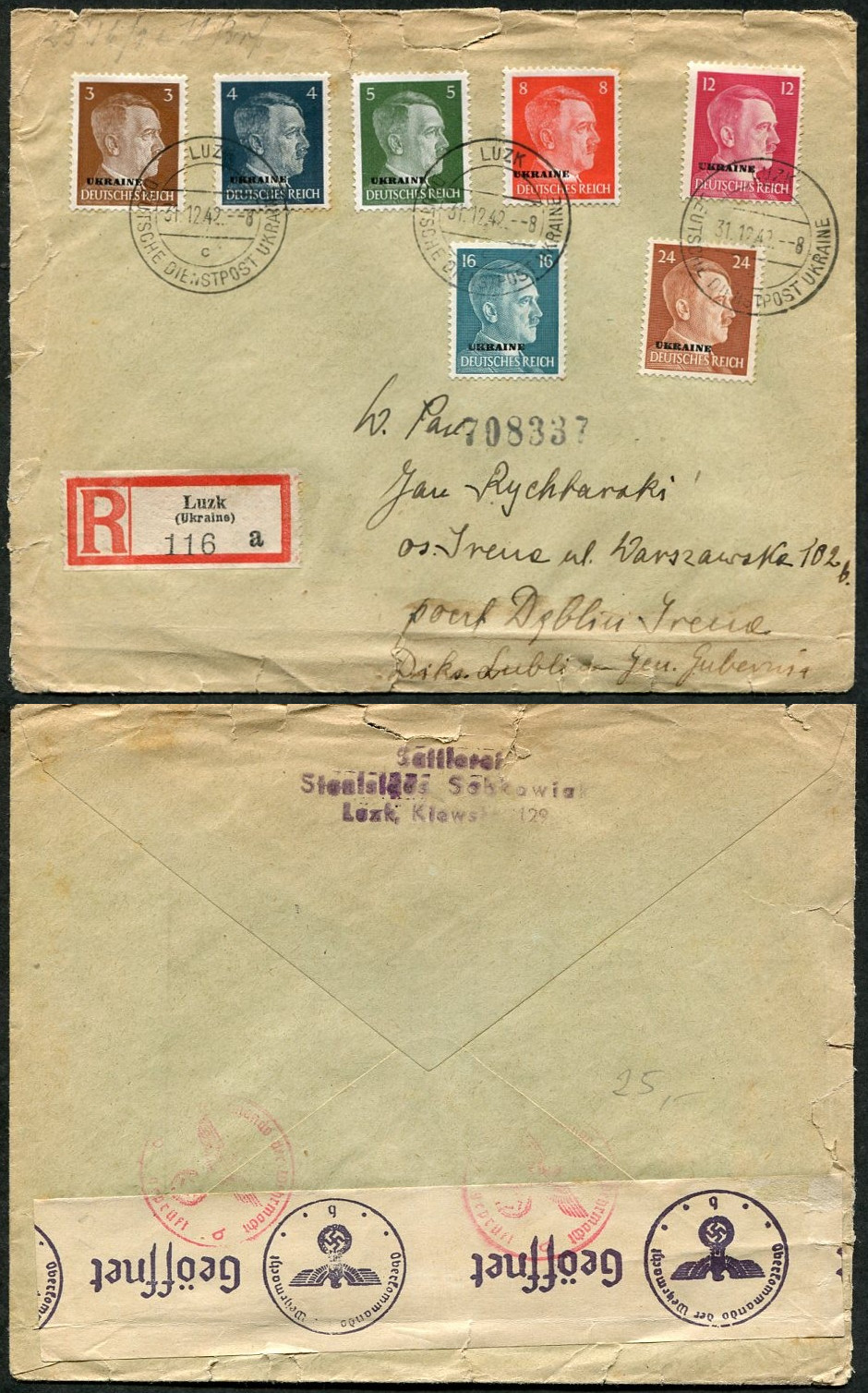 1942 Luzk (Łuck - Ukraina), koperta listu poleconego wysłanego z Łucka, siedem znaczków z nadrukiem "UKRAINE". Z tyłu koperty zaklejka w celu zamknięcia koperty po otwarciu przez cenzora. | |