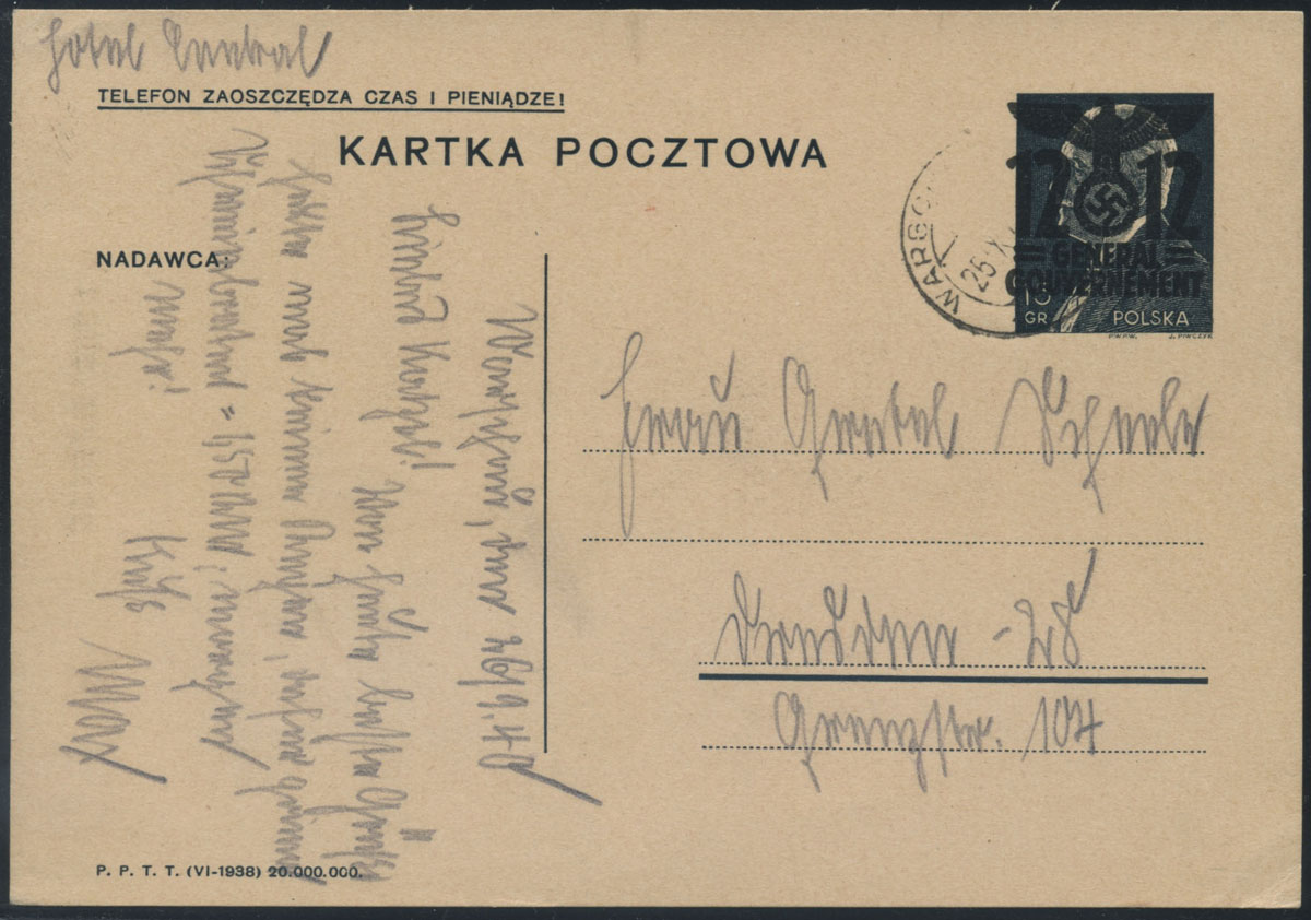 1940 wydanie przedrukowe na polskich całostkach, całostka z Warszawy do Niemiec, sygnatura VI-1938 i hasło propagandowe 3, długość napisu "KARTKA POCZTOWA" 55,5 mm, fotoatest Schweizer. | Fi.Cp3II1 |