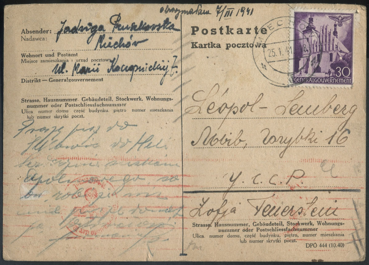 1941 kartka z Miechowa do okupowanego przez ZSRR Lwowa, stempel cenzury Wermachtu. | Fi.46 |