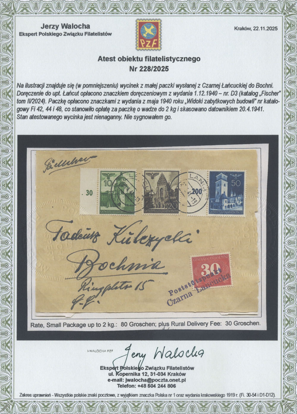 1941 wycinek adresowy z paczki wysłanej z Czarnej Łańcuckiej do Bochni, doręczenie do urzędu zwierzchniego w Łańcucie opłacono znaczkiem dopłaty, fotoatest Walocha. | Fi.D3, 42, 44, 48 |